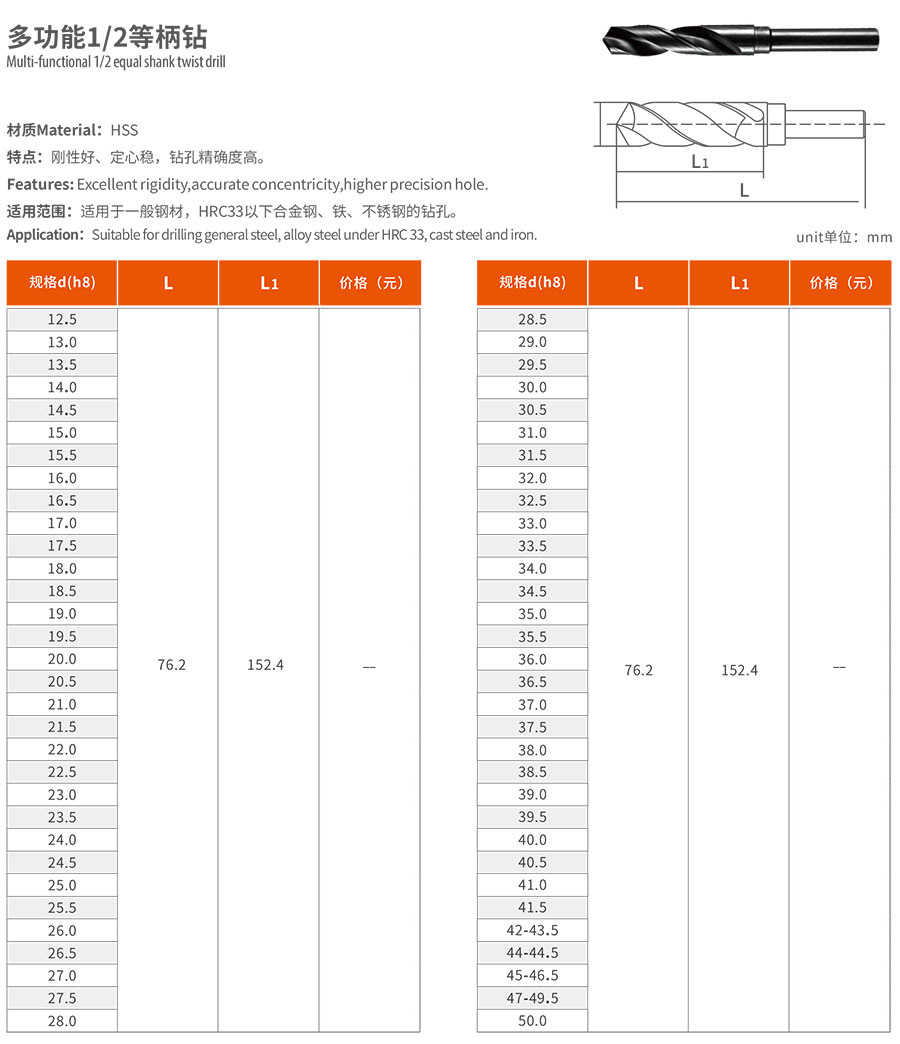 產品描述:不同規格的等柄鉆,柄部外圓尺寸采用1/2或者3/4英寸