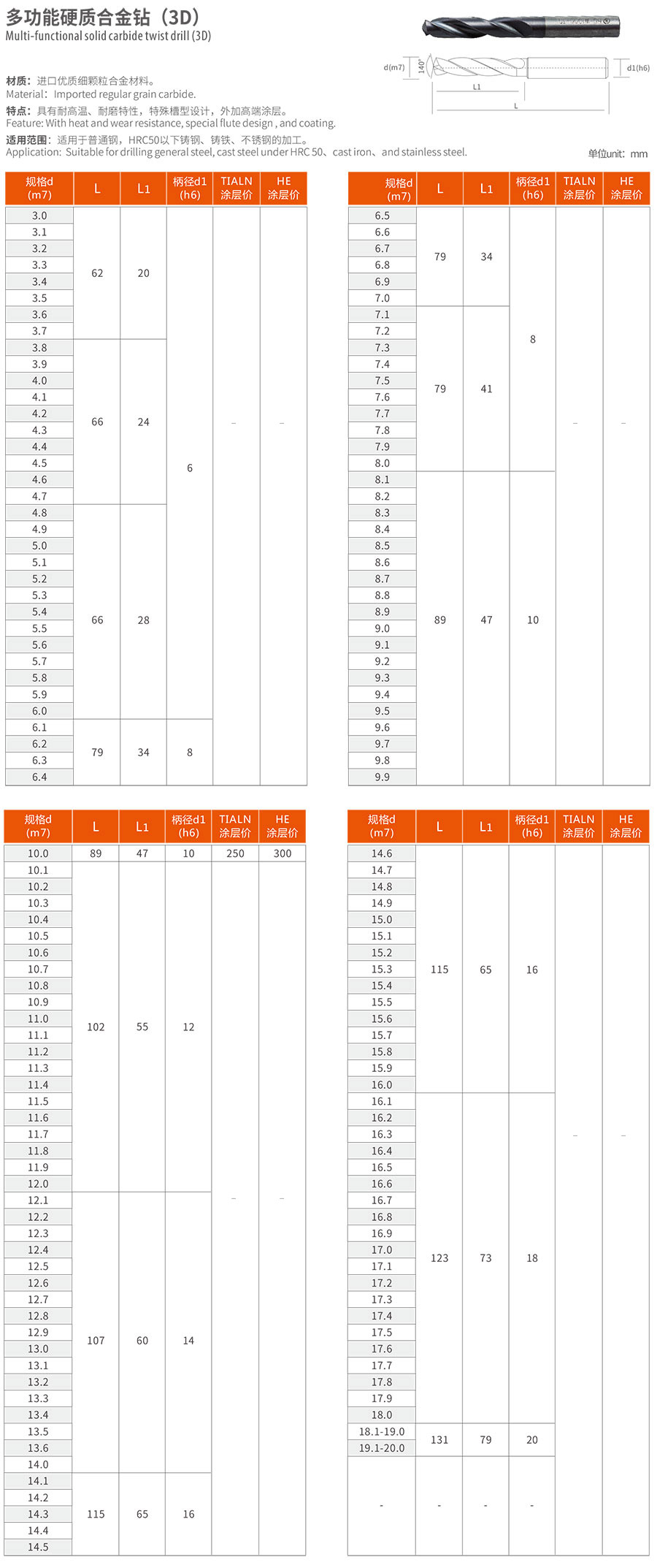 適用范圍:多功能硬質合金鉆(3D),適用于普通鋼,HRC50以下鑄鋼、鑄鐵、不銹鋼的加工