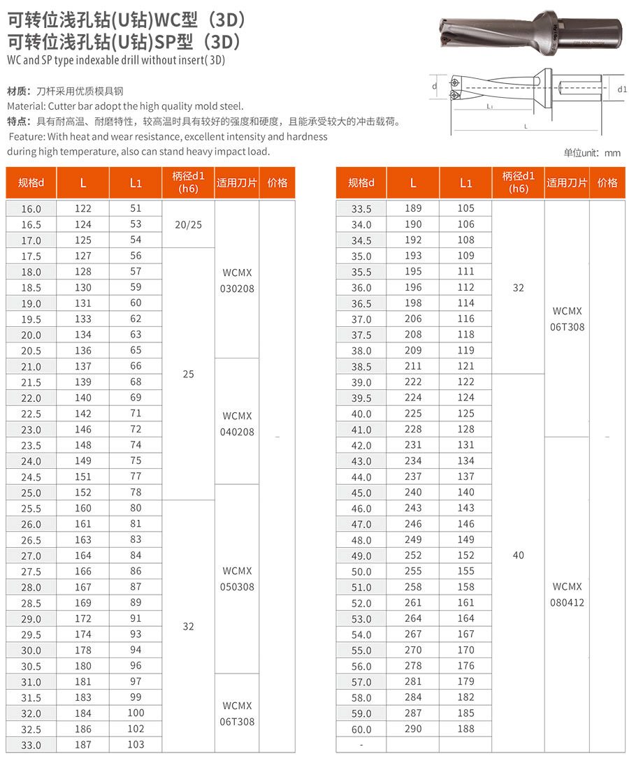 名稱:可轉(zhuǎn)位淺孔鉆(U鉆)WC型、SP型 (3D) 材質(zhì): 刀桿采用優(yōu)質(zhì)模具鋼 產(chǎn)地:中國 類別:工業(yè)倉