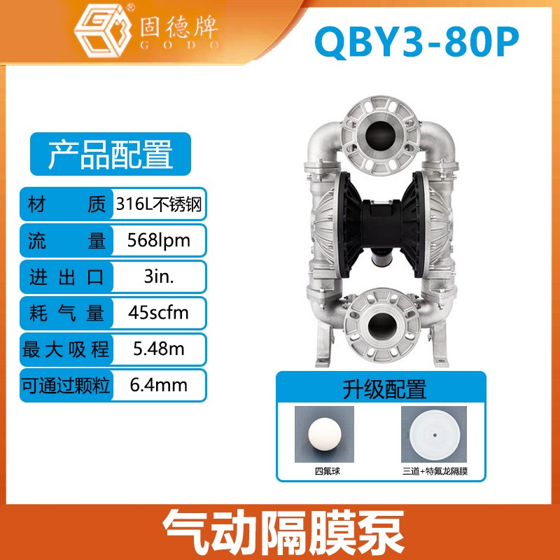 固德牌氣動隔膜泵QBY3-80P不銹鋼材質耐腐蝕膜片食品衛生級