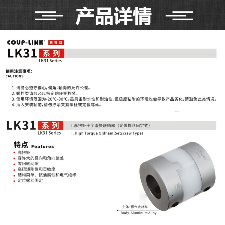 廣州菱科FA自動化配件 LK31 系列 高扭矩十字滑塊聯軸器 定位螺絲固定式